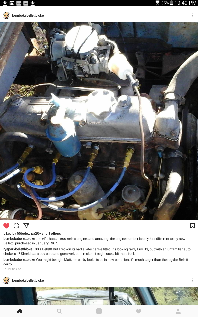 Ah, you blokes are good! Yep this Lite Elf was made from 1967 to 72. We haven't identified the year yet, but 67 or 68 looks likely. Its powered by a standard 1500 Bellett motor and column 4 speed. It has the spin on oil cap, so that suggests 67. Hmm, its a 1.25 tonner and would have to be heavier than a Bellett. Imagine it fully loaded, like a Bellett with a 1.5 tonne caravan on behind! It would do it easy! Neither of us have even seen one before, so amazing that this was sitting in Flynns wreckers in Cooma for decades. So close to Bemboka! And you are right Davo, its in Gary's shed!! From his instagram... Attachment: